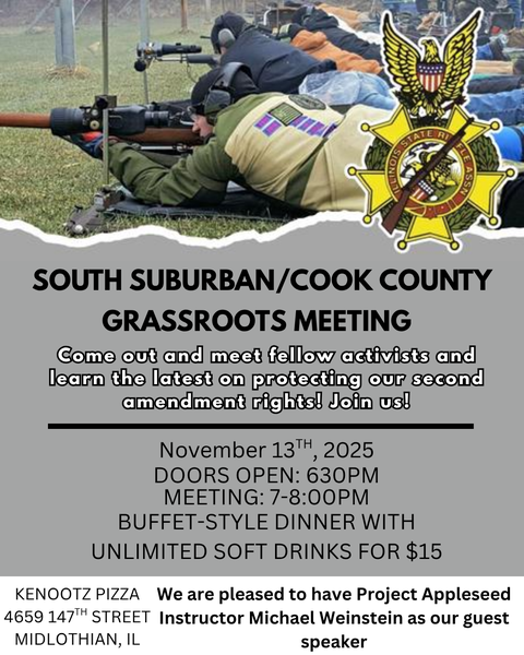 Come early, enjoy the Kenootz Pizza buffet, and connect with your fellow Illinois gun owners. Together, we’ll cover current events, training updates, and what’s next for lawful gun owners in Cook County and beyond.