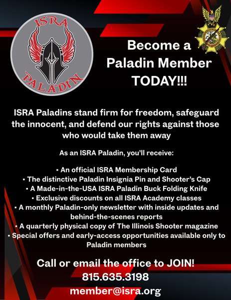Paladins stand firm for freedom, safeguard the innocent, and defend our rights against those who would take them away. Your Paladin membership strengthens ISRA’s ability to fight bad laws, train responsible gun owners, and represent you in Springfield and the