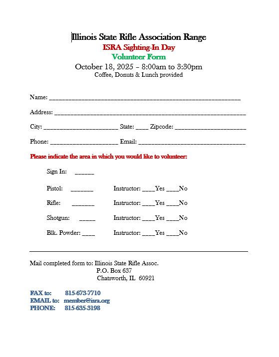We’re looking for volunteers for Sighting-In Day this Saturday, October 18, 2025, from 8:00 a.m. to 3:30 p.m. at the ISRA Range. This is one of our most popular events of the year — and it runs best when our members step up to