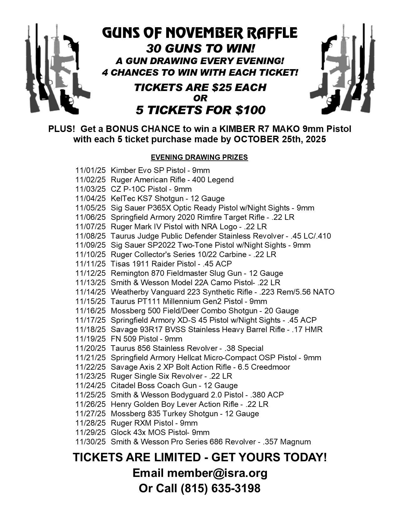 One need not be present to win and winner will be notified. Dues & donations to the ISRA are NOT tax deductible. Winner of firearm