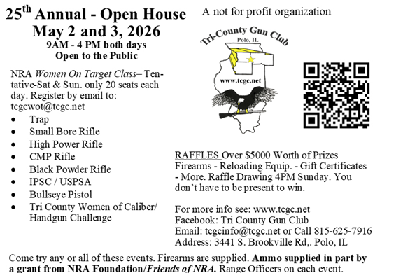 Come join our friends at Tri-County Gun Club at their 25 Annual Open House. They are offering the “NRA Women On Target Class” on Saturday, May 2, and Sunday, May 3 (only 20 seats available each day), and there will be raffles of